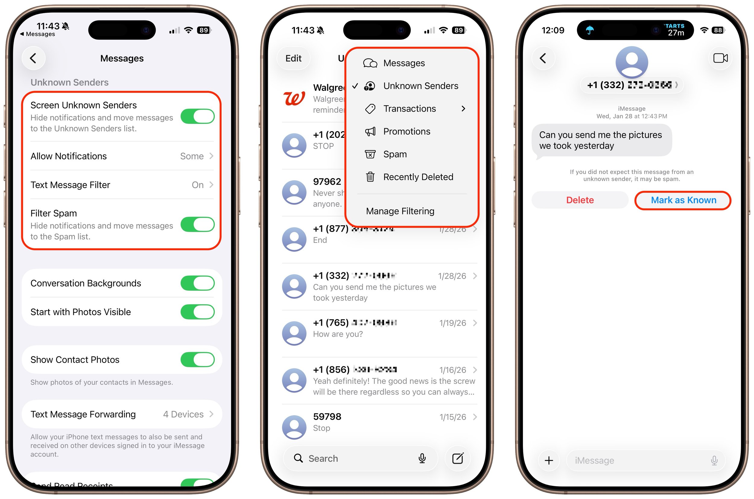 Losing Messages or Calls? Look in the Unknown Senders/Callers Filter In iOS, iPadOS, and macOS 26, Apple added an option in the Messages app to filter messages from unknown people and those marked as spam by the carrier. To enable filtering, open Messages, tap the Filter button in the upper-right corner, tap Manage Filtering, and turn on Screen Unknown Senders and Filter Spam. Once those are enabled, the Filter menu gains two new options: Unknown Senders and Spam. If a text from an unknown person comes in, the main app icon will get a red badge, but you won’t see the new message in the usual list. Instead, use the Filter menu—which also gets a blue badge—to switch to Unknown Senders or Spam and look in those lists. The Phone app works similarly—enable call filtering in Settings > Apps > Phone under Call Filtering, and unknown callers will appear in separate lists accessible via the Filter button in the Phone app’s Recents or Calls views. To move a conversation out of Unknown Senders, tap Mark as Known.